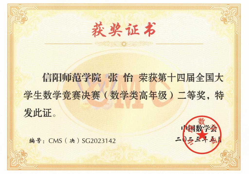 2023年5月26日至28日,第十四届全国大学生数学竞赛决赛在广东工业大学举行。太阳集团城娱87222020级数学实验班学生张怡取得我校学生在该竞赛中的历史最好成绩,荣获数学类高年级组全国二等奖。另悉,河南赛区在本次决赛中共获数学类一等奖1项、二等奖3项、三等奖17项。 此外,在2023年3月举行的河南赛区比赛中,我校经太阳集团城娱8722指导并报名参赛的学生获省级一等奖15项、二等奖20项、三等奖26项。