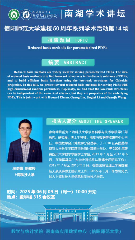 庆建校50周年之南湖讲坛:上海科技大学廖奇峰副教授——Reduced basis methods for parameterized PDEs