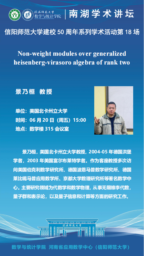 庆建校50周年之南湖讲坛:美国北卡州立大学景乃桓教授——Non-weight modules over generalized heisenberg-virasoro algebra of rank two