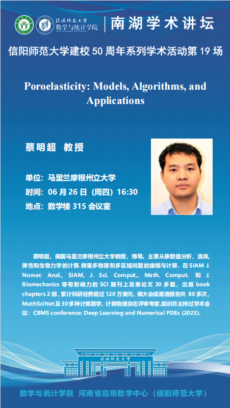 庆建校50周年之南湖讲坛:马里兰摩根州立大学蔡明超教授——Poroelasticity: Models, Algorithms, and Applications